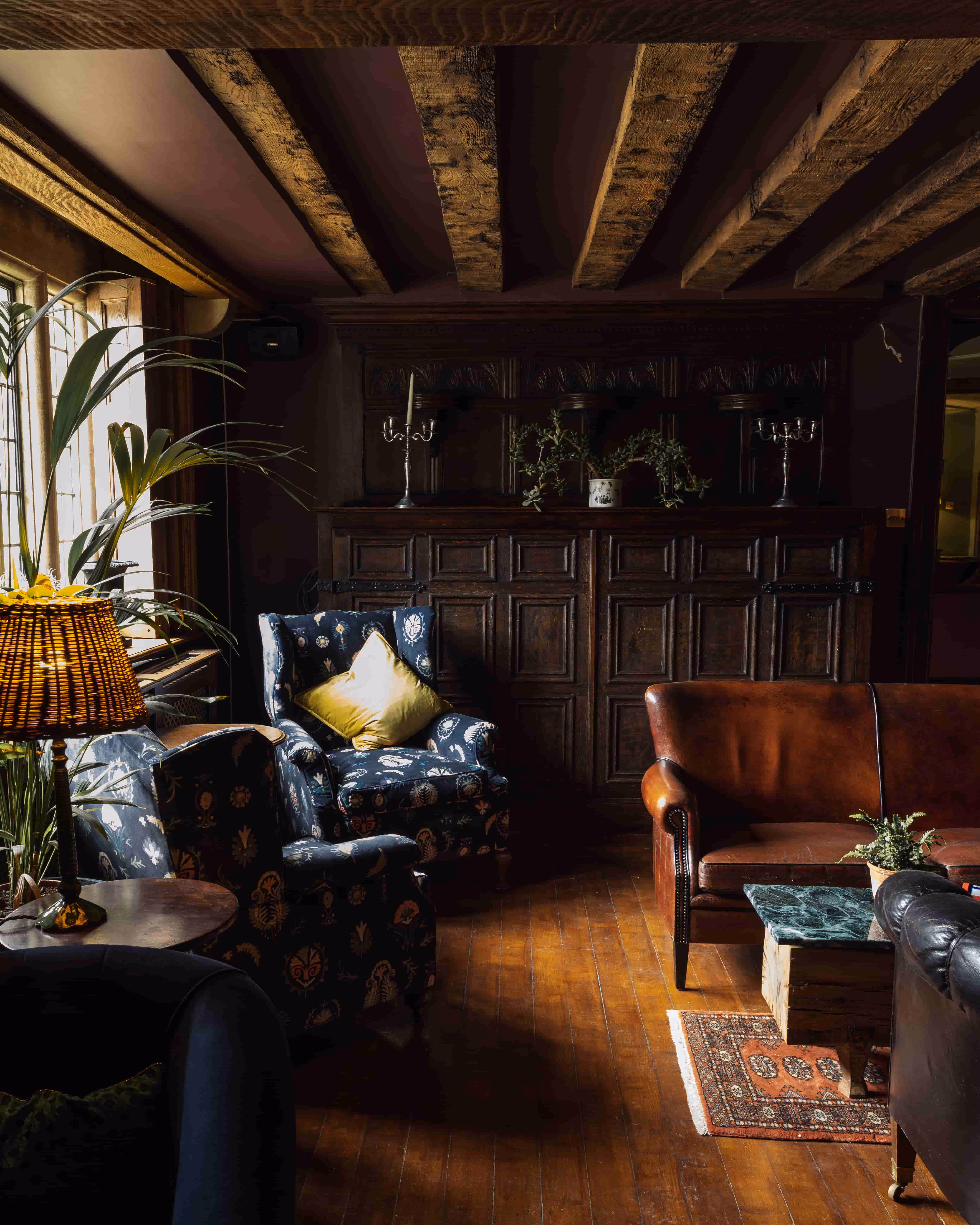 Sink in-to sofas, large inglenook fireplaces, books & magazines. Delicious wines & cocktails, pots of tea, excellent coffee. Bar menu of snacks, sandwiches & cake. Dogs welcome.